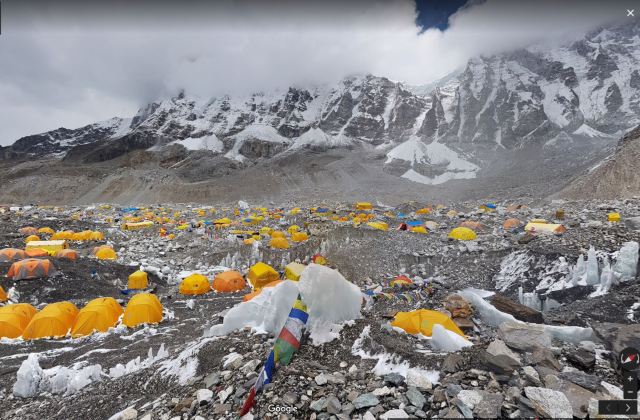 This week Pegman takes us to the highest peak in the world, Mount Everest, also known as Sagarmatha. Thanks to the wonder of Google Maps (and the many intrepid climbers industrious enough to carry the necessary camera equipment to such elevations) we can climb Mount Everest in the comfort our bathrobes and fuzzy slippers.